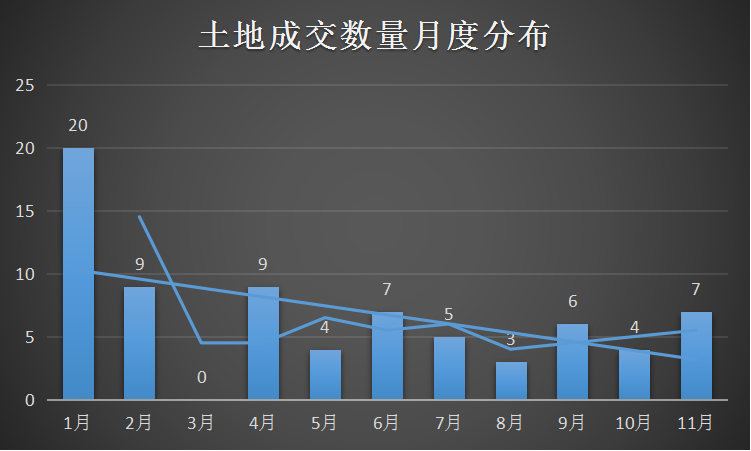 从月份散布来看,年头北京土地商场较为活泼,特别是1月份成交土地20块,后总成交量呈下行趋势,11月再度升温昂首,成交7块土地。