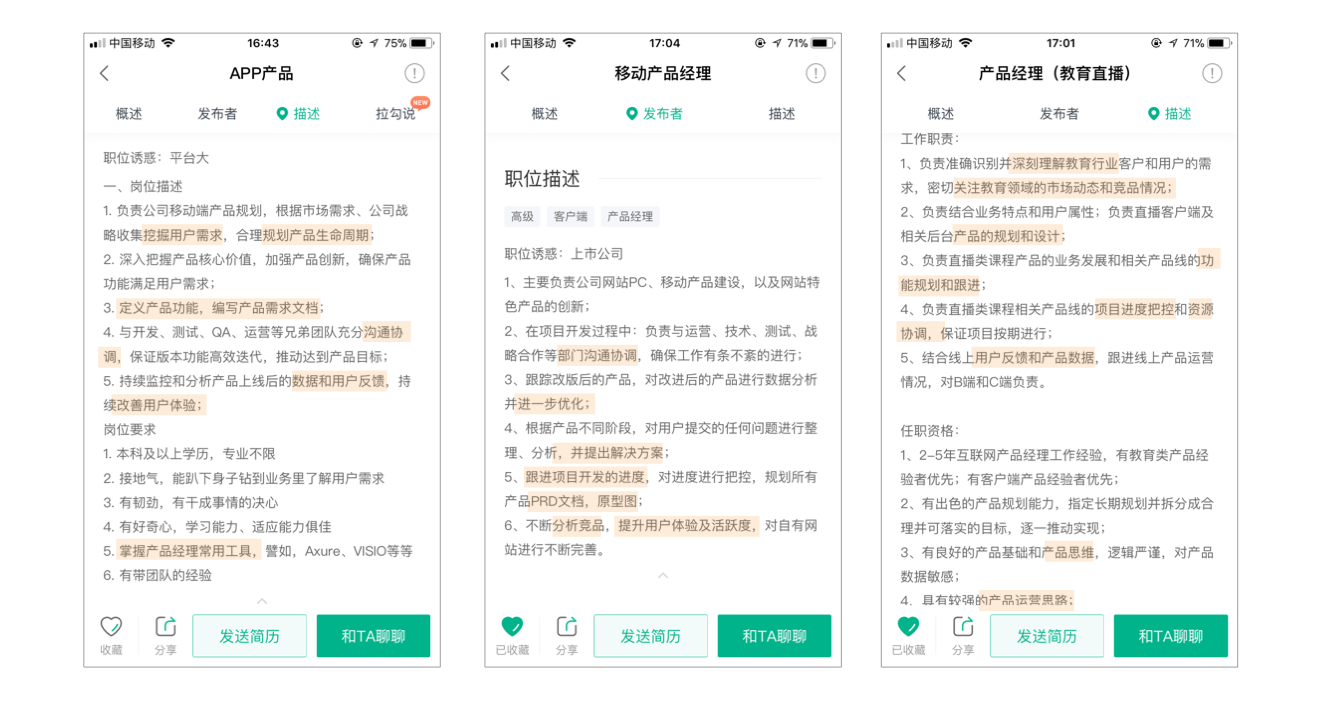 我在招聘信息上标识了一些关键内容:挖掘客户的真实需求、产品生命周期管理、定义产品功能、输出需求文档、原型图、各部门沟通协调、根据数据和用户反馈优化产品体验、竞品分析、理解行业、项目进度跟进等等。