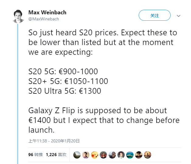 此外,Max Weinbach预估了三星下一款折叠式智能手机Galaxy Z Flip的价格为1400美元(折合人民币9680.6元),比S20 Ultra贵,不过相比较于Galaxy Fold京东在售15999元的价格,Z Flip现已相对廉价很多了(针对折叠手机而言)。