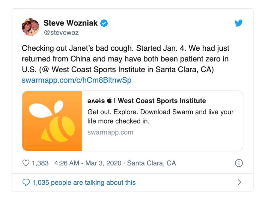 1月23日,沃兹尼亚克发推称:“珍妮特和我正在从两周前在亚洲感染的病毒中康复,我置疑这或许是新式冠状病毒,由于咱们没去过墨西哥。”这一条推文的定位是在他自己家里。