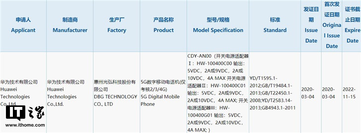 IT之家了解到,这款型号为CDY-AN00的华为5G新机装备40W开关电源适配器,包含开关电源适配器Ⅰ HW-100400C00、开关电源适配器Ⅱ HW-100400C01和开关电源适配器III HW-100400G01,与此前入网的华为P40 Pro(型号为ANA-AN00)电源适配器共同。