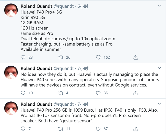 [PConline 资讯]来自爆料人Roland Quandt的音讯显现,华为P40 Pro256GB版的价格是1099欧元,约为人民币8519元。