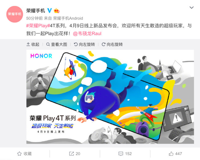 新机官宣之际,荣耀Play系列新产品司理韦骁龙也在微博与我们碰头,他表明,Play系列是一个风趣的产品系列。从“超级玩家 天然生成敢造”的Slogan不难看出,荣耀Play 4T系列将是一款适当风趣的产品。