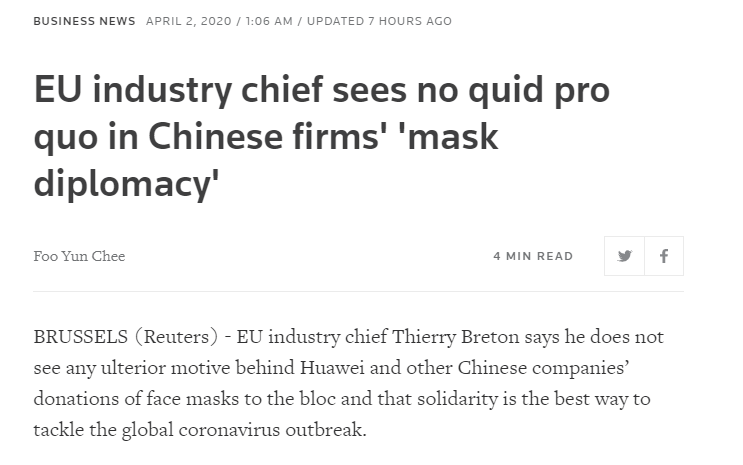 对此欧盟内部商场和服务专员蒂埃里·布雷顿(Thierry Breton)标明,他不认为华为和其他我国公司向欧盟捐献口罩背面有什么不可告人的动机,由于联合一致才是应对全球新式冠状病毒疫情爆发的最佳途径。据报导,布雷顿本来期望在1月拜访我国,向我国政府供给协助,但遭到安全问题的约束而未能成功。他还标明,现在与其为谁做得更多而争持,不如携手应对危机。