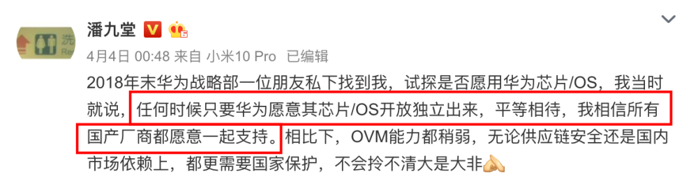 小米工业出资部合伙人潘九堂最近也针对这件工作宣布了观点,他表明只需华为乐意敞开独立芯片和OS出来,相等对待其他厂商,信任一切国产厂商也会乐意一同支撑,相比之下OPPOvivo小米的供应链和自研才能比较弱,和华为相同都需求国家的维护,小米不会做出一些不分大是大非和故意针对华为的工作(指前天小米10海外版包装盒上的谷歌服务标语)。