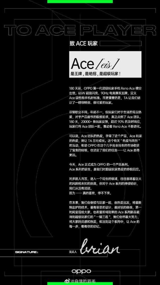 今天上午,OPPO 广东移动通讯有限公司官方微博发布 Ace 超级玩家精力视频,slogan 为 " 酷爱让你成为自己 "。一起,OPPO 副总裁、全球营销总裁沈义人在微博发布《致 Ace 玩家》的公开信,正式宣告 Ace 成为 OPPO 的一个产品系列。