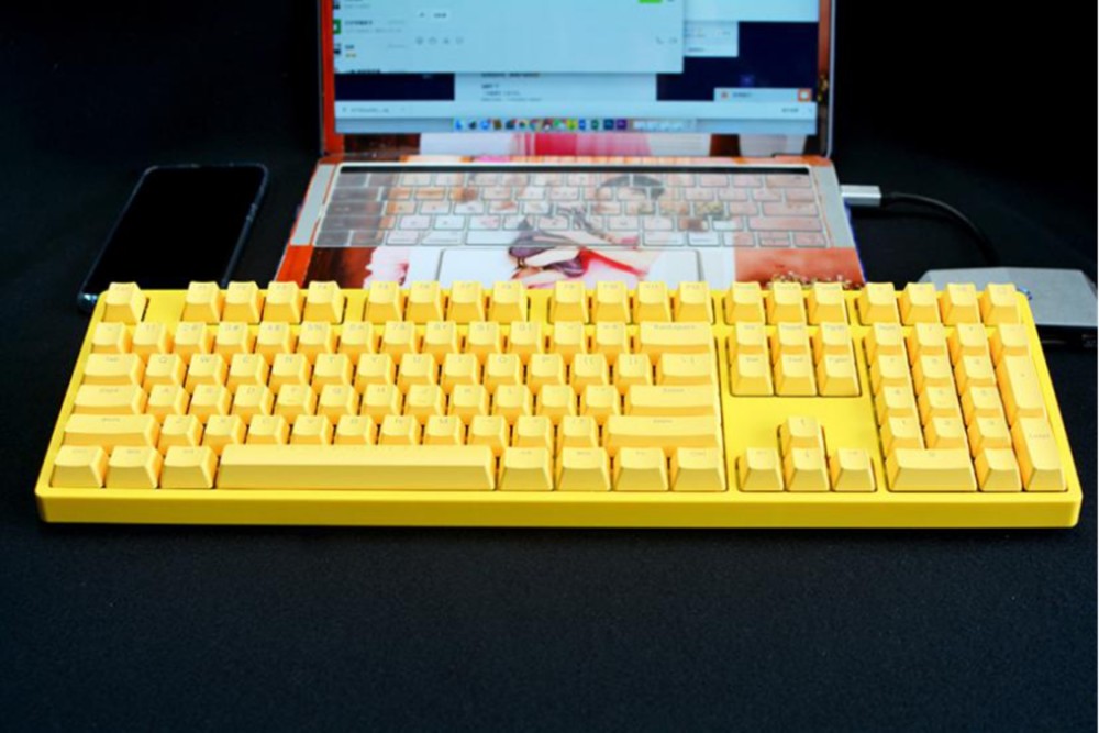 在外观上是有着多种颜色可以再一次进行选择的,像元气绿、灵动黄、逐梦蓝以及软萌粉,而吖有就选择了灵动黄,整个键盘除了键帽上的字体是灰色的话,其他全身都是黄色,不过这种黄也没那么低沉暗淡,比想象中更加的亮眼,看上去十分的具有一种层次感。整体看上去也是十分的硬朗,放在桌子上很大气。